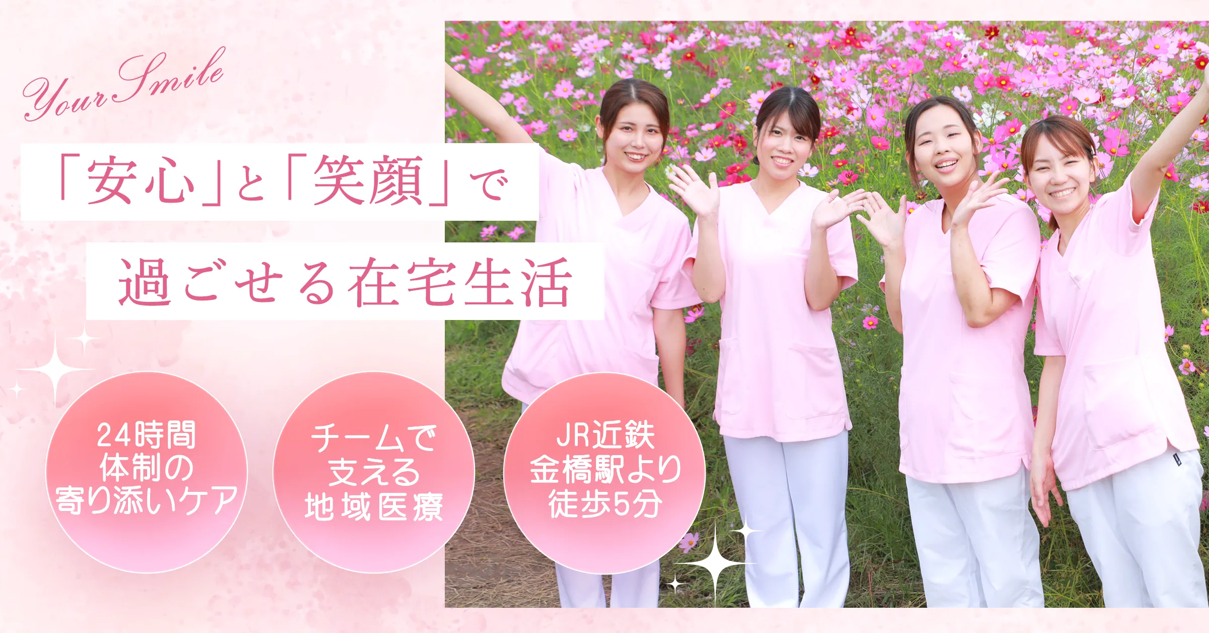 医療と毎日の暮らしの“ちょうど真ん中”に立って、 みなさまの「安心」と「笑顔」をお守りします。
