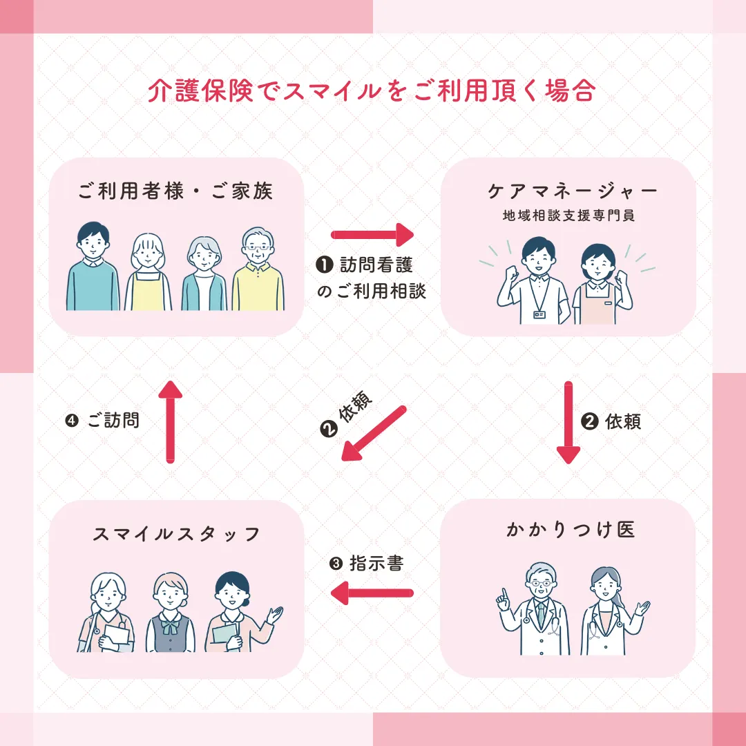 スマイル訪問看護ステーションでは、 地域で医療や介護が必要なご利用者様が 安心してご自宅で自分らしくお過ごしいただけるよう、 医療機関様やケアマネジャー様をはじめとする関係機関と連携し、 心を込めて支援させていただきます。
