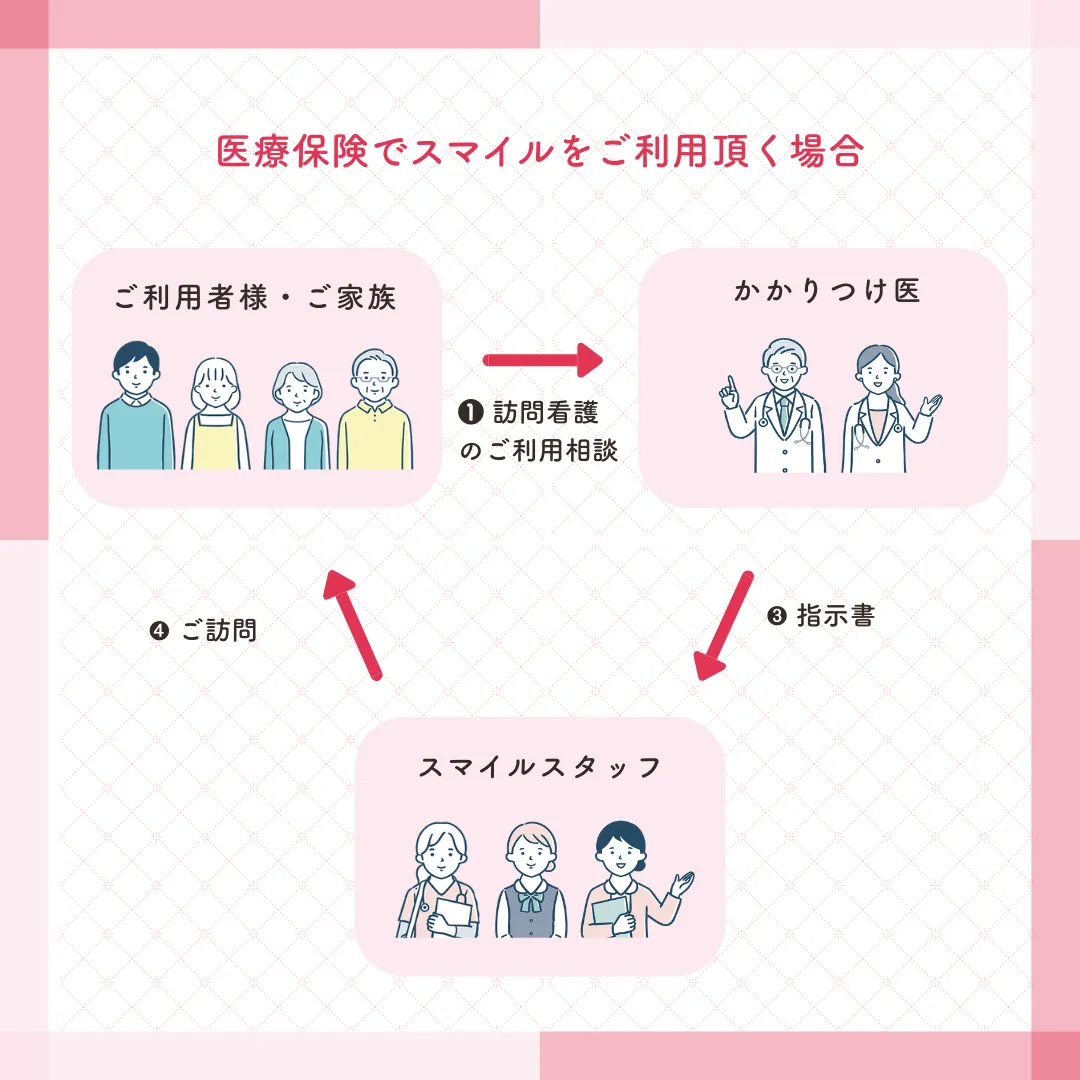 ご利用される方の年齢やお持ちの疾患、要介護認定によって、ご利用の方法が変わります。医療保険、介護保険を利用される場合、障害者総合支援法を適用される場合など、サービス利用までのステップが変わりますので、ご確認をお願いします。