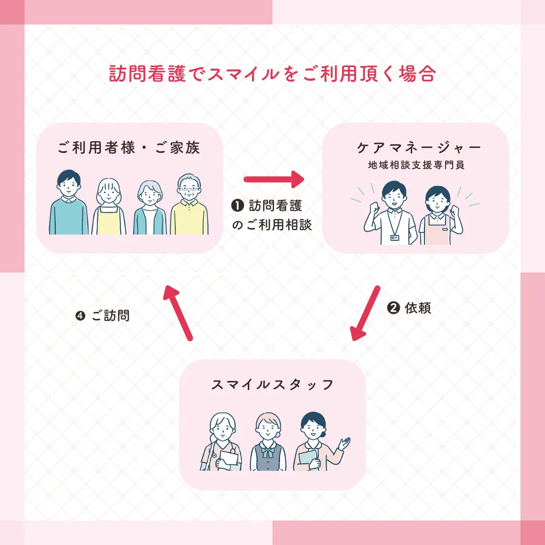 スマイルに直接ご連絡いただき、その後、当ステーションサービスを利用したい旨をご担当のケアマネジャー・相談支援専門員様にお伝え下さい。ご利用までの調整をさせていただきます。